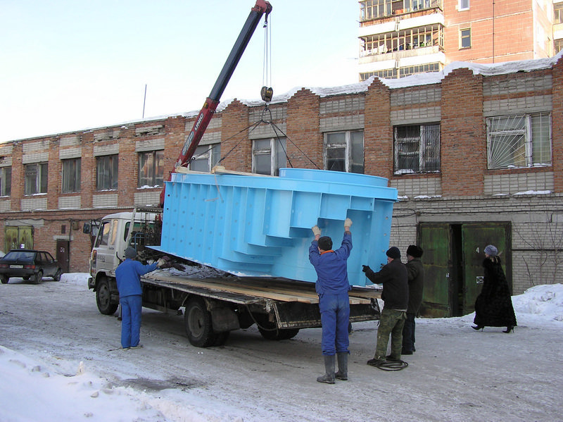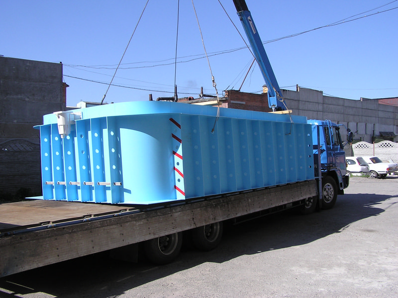 Погрузка прямоугольного бассейна, изготовленного в цехе
