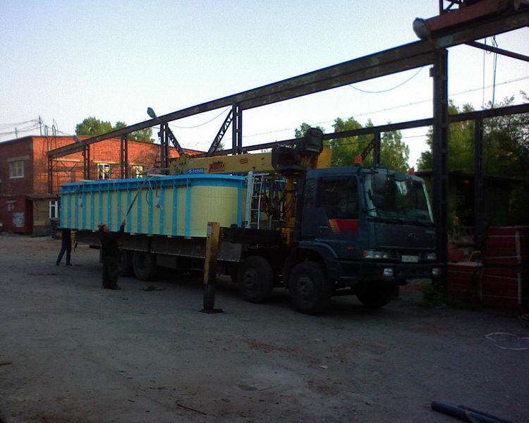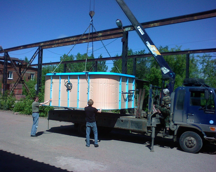 Погрузка крупногабаритного прямоугольного бассейна, изготовленного в цехе